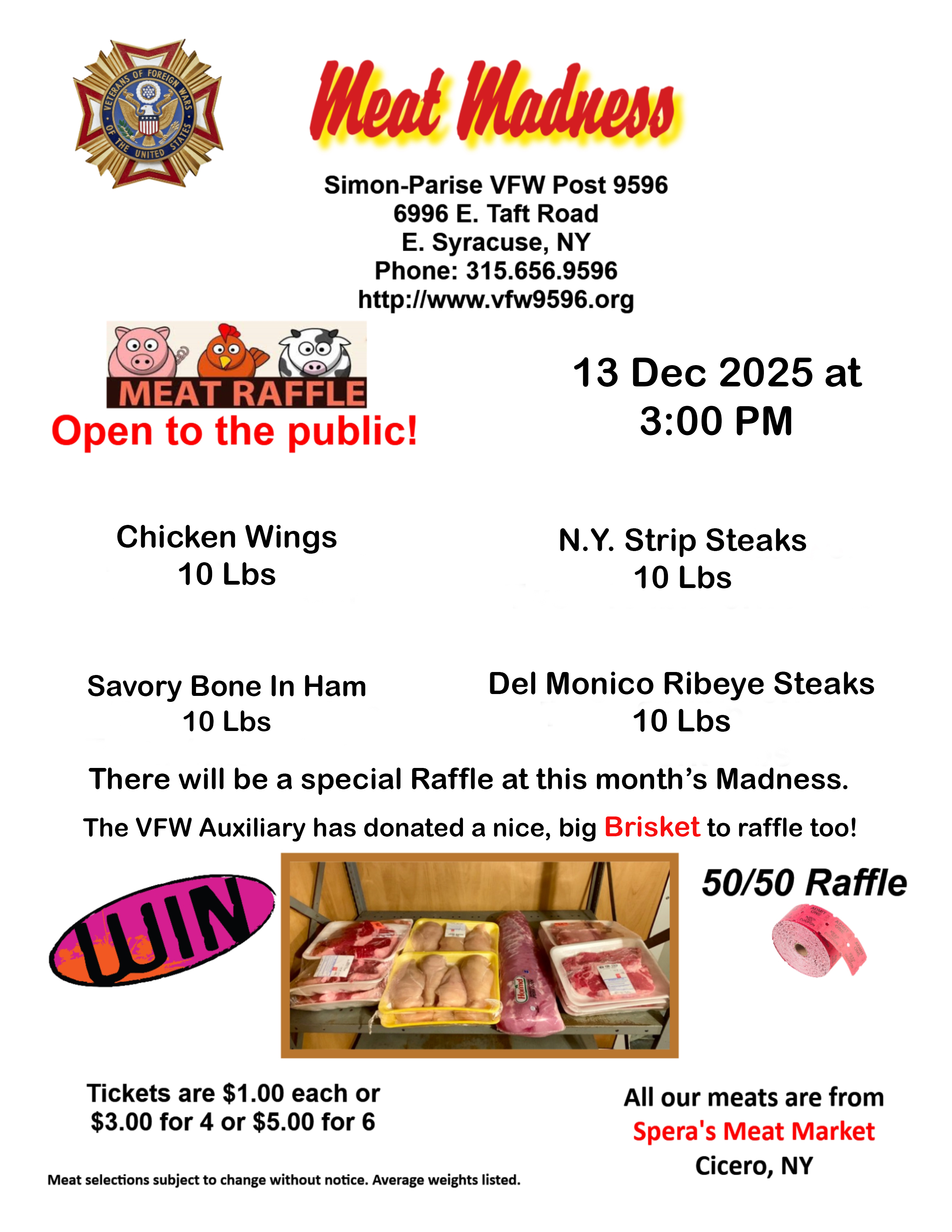 Meat Madness is a meat raffle that we perform at the Post on the second Saturday each month (subject to change). Generally there are four(4) different kinds of meats or cuts of meats, each being offered in a 10 pound package. The best way to describe the operation is that there are 8 rounds of offerings and ticket sales. For example, in the first round, tickets will be offered for let's say, the chicken breasts. After all the tickets have been sold to customers that want one for that offering, a winning ticket is drawn. The winner may either collect their prize or we will keep it in our cooler until the end of the event. After each drawing the remainder of tickets are discarded and a new round starts with new tickets.